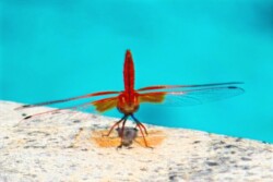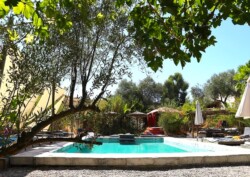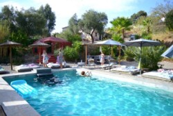 A small outdoor swimming pool with turquoise water surrounded by stone paving and gravel, set in a lush hillside garden. There are thatched sun umbrellas, lounge chairs, and colorful flowering plants nearby. In the background, red round cabins are nestled among green vegetation and hills under bright sunlight.