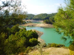 Alt text: A scenic view of a turquoise lake surrounded by forested hills and rocky shores under a clear sky. Pine trees frame the image in the foreground, adding depth to the serene, natural landscape. The calm water reflects the greenery, creating a peaceful and inviting atmosphere.